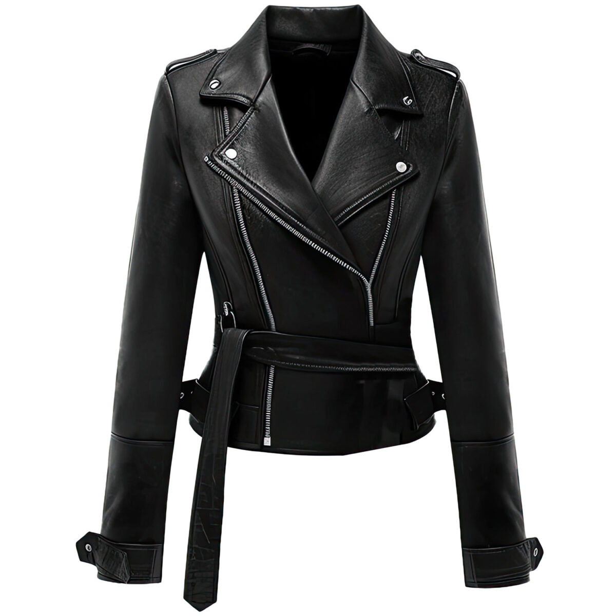 The Women’s Black Genuine Sheepskin Classy Double Breasted Lapel Collar Slim-fit Racing Outfit Smooth Asymmetric Motorbike Leather Jacket is a testament to sophisticated style and functionality. Made with premium black genuine sheepskin, it offers unparalleled warmth and a soft feel, making it perfect for cooler weather. The jacket’s notch lapel collar and unique double-breasted YKK zipper closure add a modern twist to the classic motorbike design, while the adjustable waist belt ensures a flattering fit for any body type. Zipper cuffs not only provide a practical element but also contribute to the Jacket ‘s sleek racing aesthetic. Whether you’re hitting the road on your motorcycle or looking for a stylish outerwear option, this leather jacket is an impeccable choice for those who value quality, warmth, and fashion-forward design.