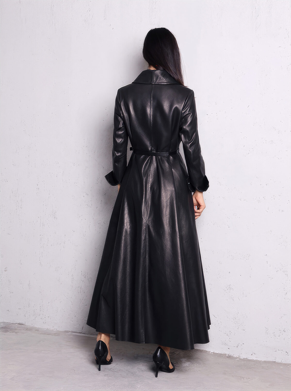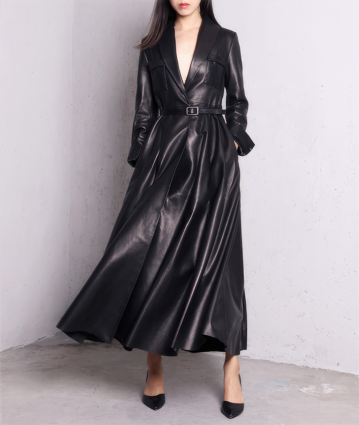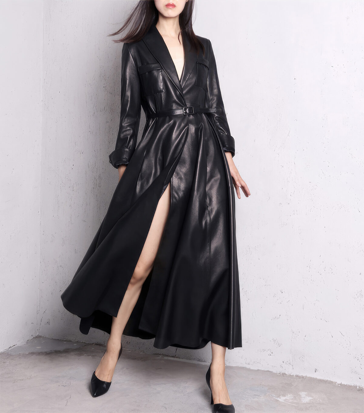 Immerse in elegance with our Women’s Black Genuine Sheepskin Leather Trench Coat. The luxurious leather and shawl lapel collar emanate sophistication, while the single breasted design and waist belt offer a flattering silhouette. Functional features like chest utility pockets enhance practicality without compromising style. This ankle-length coat, inspired by classic runway fashion, allows you to make a stunning style statement, whether it’s a casual outing or a formal event. Experience the blend of fashion and functionality with our Leather Trench Coat.