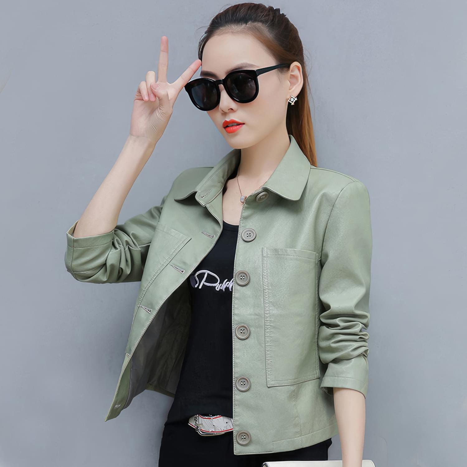Enhance your wardrobe with our Women’s Pastel Green Genuine Sheepskin Shirt Collar Moto Café Racer Leather Jacket. Crafted from genuine sheepskin leather, this jacket offers both durability and style. The classic shirt collar adds a touch of sophistication, while the single breasted button closure provides a secure and refined look. With ample space pockets, you can conveniently carry your essentials with you. This jacket effortlessly blends sporty elements with Korean fashion chic, making it a versatile choice for various occasions. Elevate your outfit and make a fashion statement with this slim fit leather jacket.