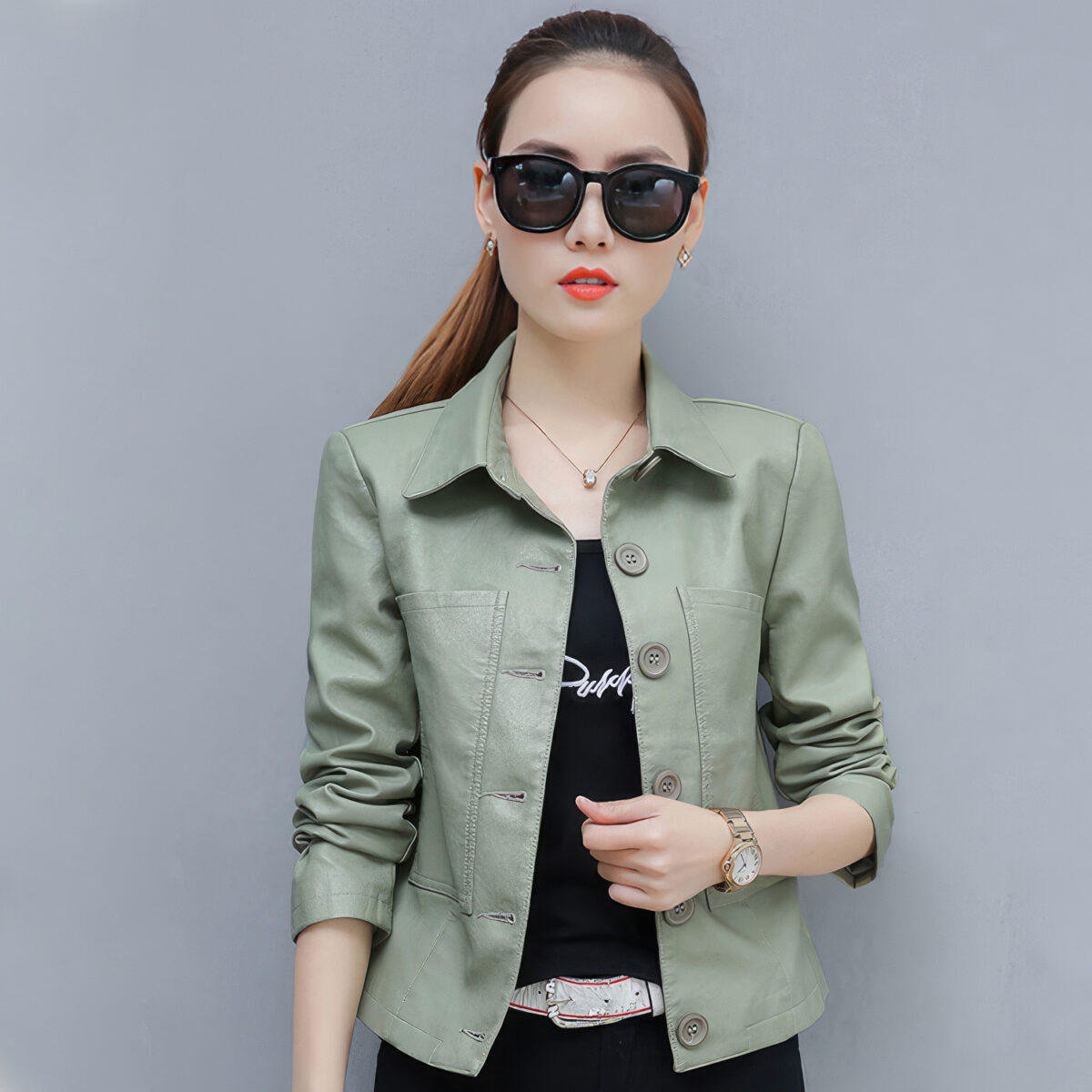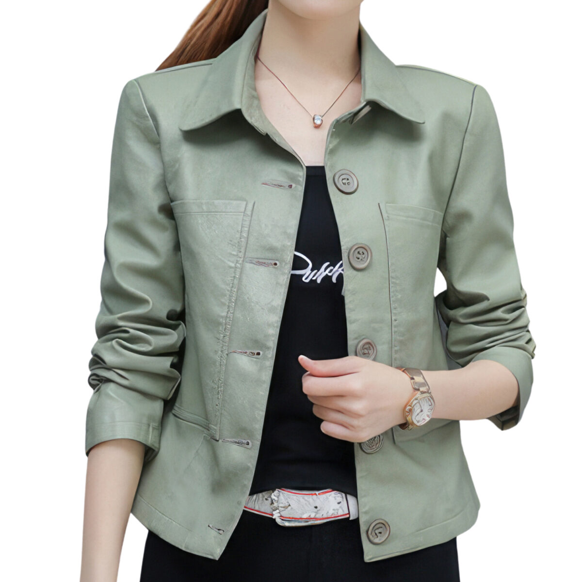 Enhance your wardrobe with our Women’s Pastel Green Genuine Sheepskin Shirt Collar Moto Café Racer Leather Jacket. Crafted from genuine sheepskin leather, this jacket offers both durability and style. The classic shirt collar adds a touch of sophistication, while the single breasted button closure provides a secure and refined look. With ample space pockets, you can conveniently carry your essentials with you. This jacket effortlessly blends sporty elements with Korean fashion chic, making it a versatile choice for various occasions. Elevate your outfit and make a fashion statement with this slim fit leather jacket.