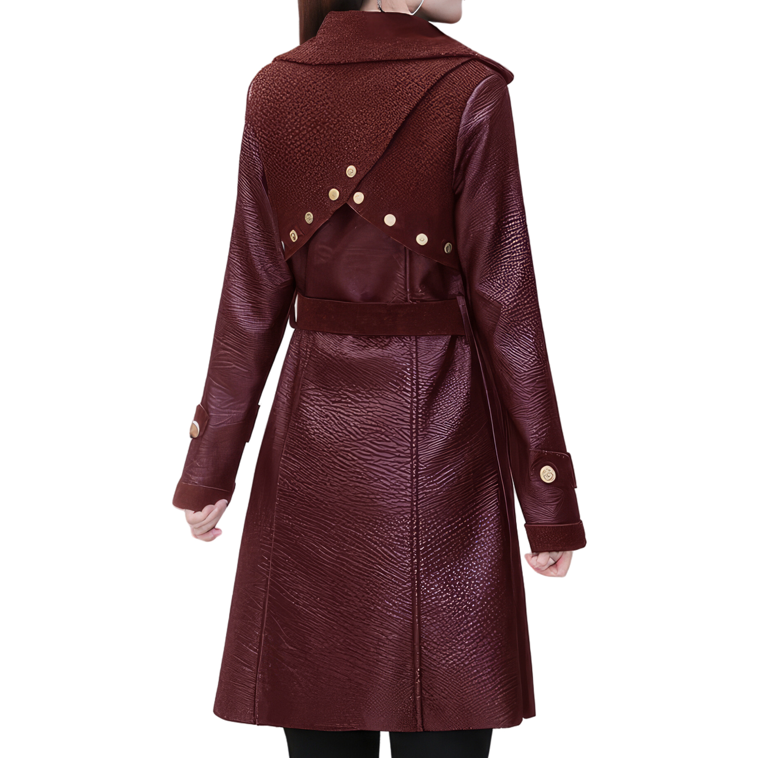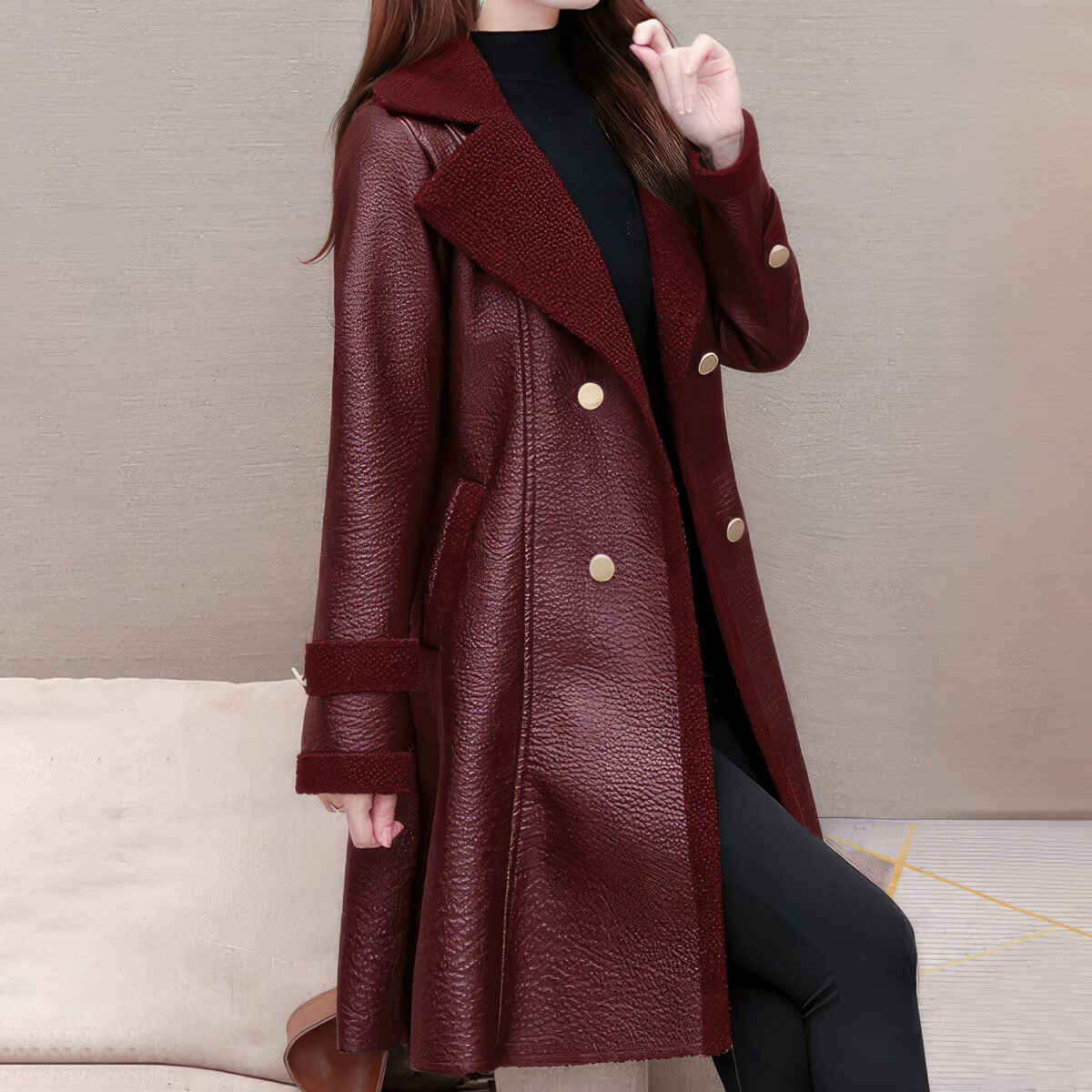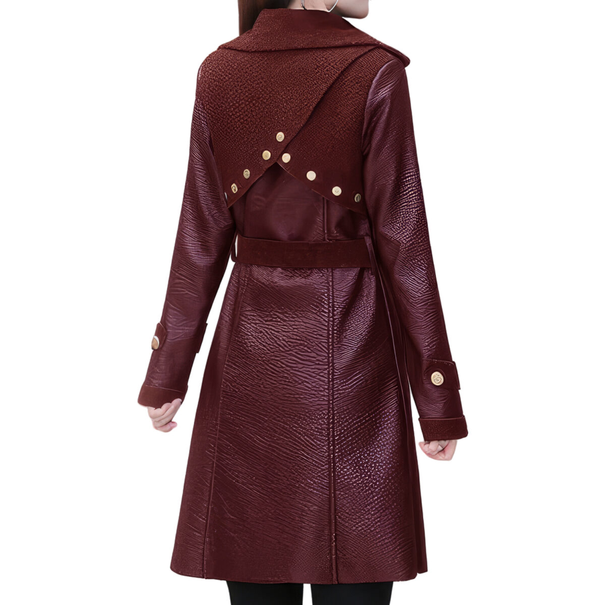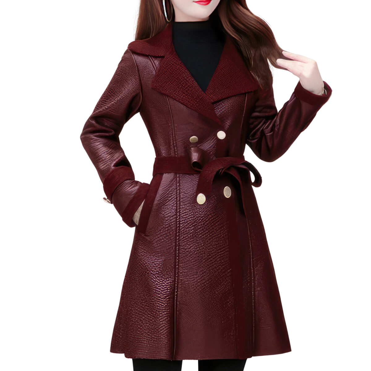 Experience the perfect blend of warmth, style, and luxury with our Women’s Wine Red  Genuine Sheepskin Leather Coat. Crafted from genuine sheepskin leather, this coat offers durability along with a soft, premium feel. The inside is fully lined with Sherpa shearling faux fur, providing ultimate warmth and comfort, perfect for chilly days. The double-breasted button closure with a belt ensures a snug, flattering fit, while the lapel collar with a unique back design adds a sophisticated touch. Inspired by Korean fashion trends, its mid-length and slim fit silhouette showcase an elegant aesthetic, making this coat a perfect addition to your winter wardrobe.