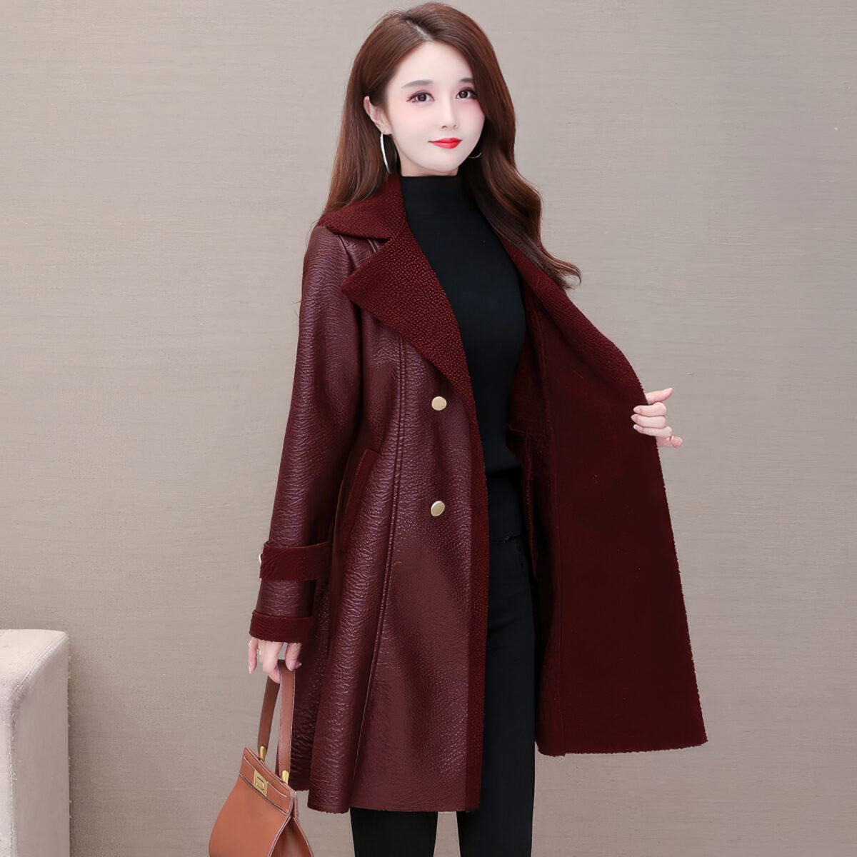 Women’s Red Wine Sheepskin Shearling Leather Coat – Elegant Korean Style Slim-Fit