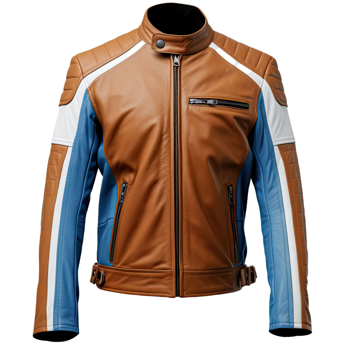 Discover The Ultimate In Biker Chic With The Men’s Sapphire Blue Brown Genuine Sheepskin Stylish Biker Stand Collar Multi Zipper Smooth Quilted Motorcycle Leather Jacket. This premium jacket combines high-quality genuine sheepskin leather with a sleek design to offer both durability and a luxurious feel. The stand collar with snap button closure and quilted sleeves and shoulders add a touch of elegance and edge to your look. With a reliable YKK zipper for secure closure and multiple slanted zipper pockets for ample storage, this jacket is not only fashionable but also practical. Whether you’re hitting the road or heading out for a casual event, this jacket is sure to make a statement while providing comfort and style.