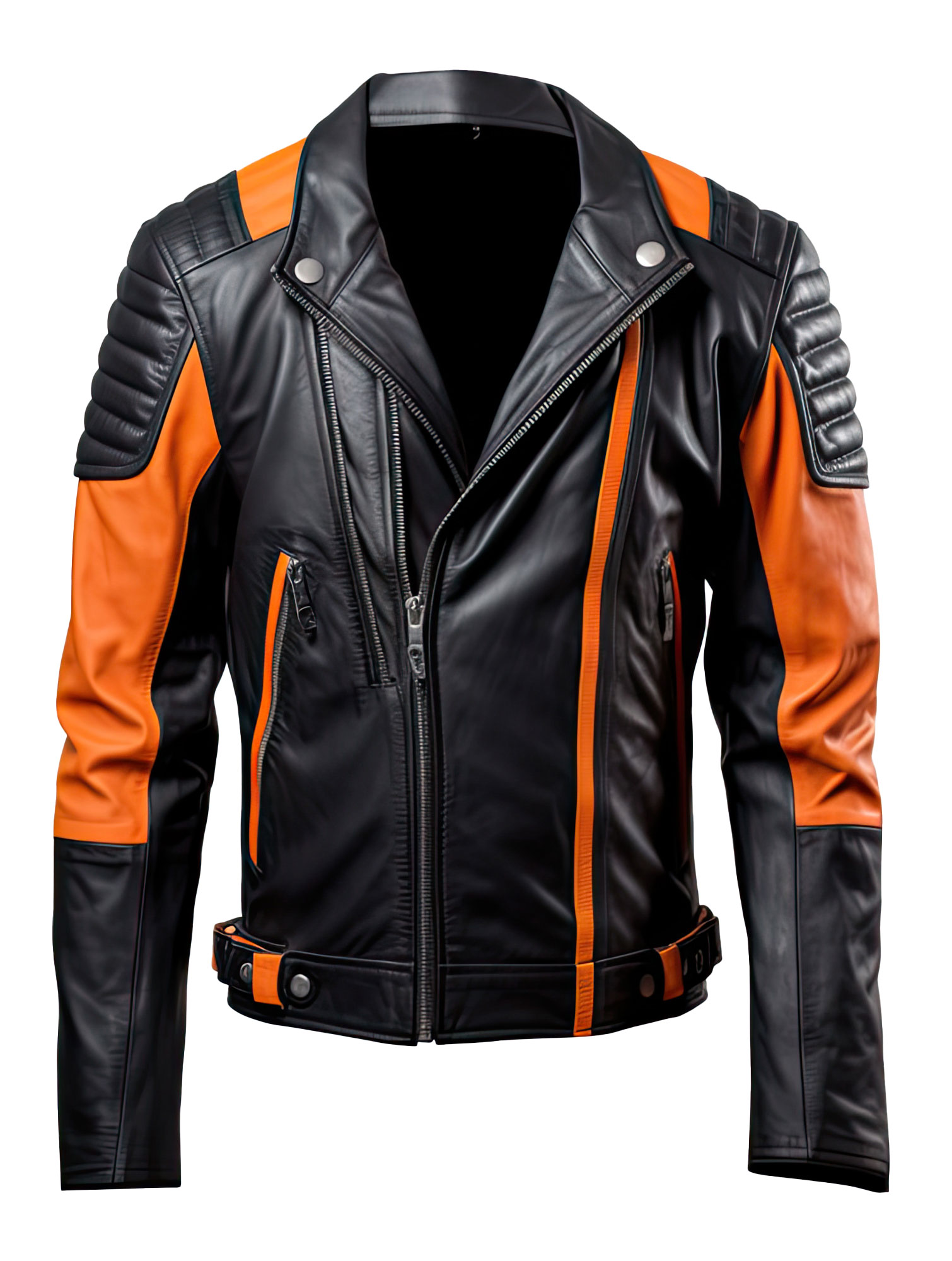 Make a bold statement with our Men’s Black Orange Moto Racer Leather Jacket. This outerwear piece is expertly crafted from genuine sheepskin lambskin, known for its exceptional softness and resilience. The jacket’s stand collar and smooth zipper offer a contemporary look, perfect for the fashion-savvy individual. Equipped with slanted zipper pockets, it provides both convenience and style. The quilted shoulder details infuse a touch of elegance and provide additional padding for comfort. With the inclusion of a stylish waist strap, ensuring both comfort and a streamlined look. This jacket is a versatile and trendy choice for winter, suitable for both casual rides and everyday fashion.
