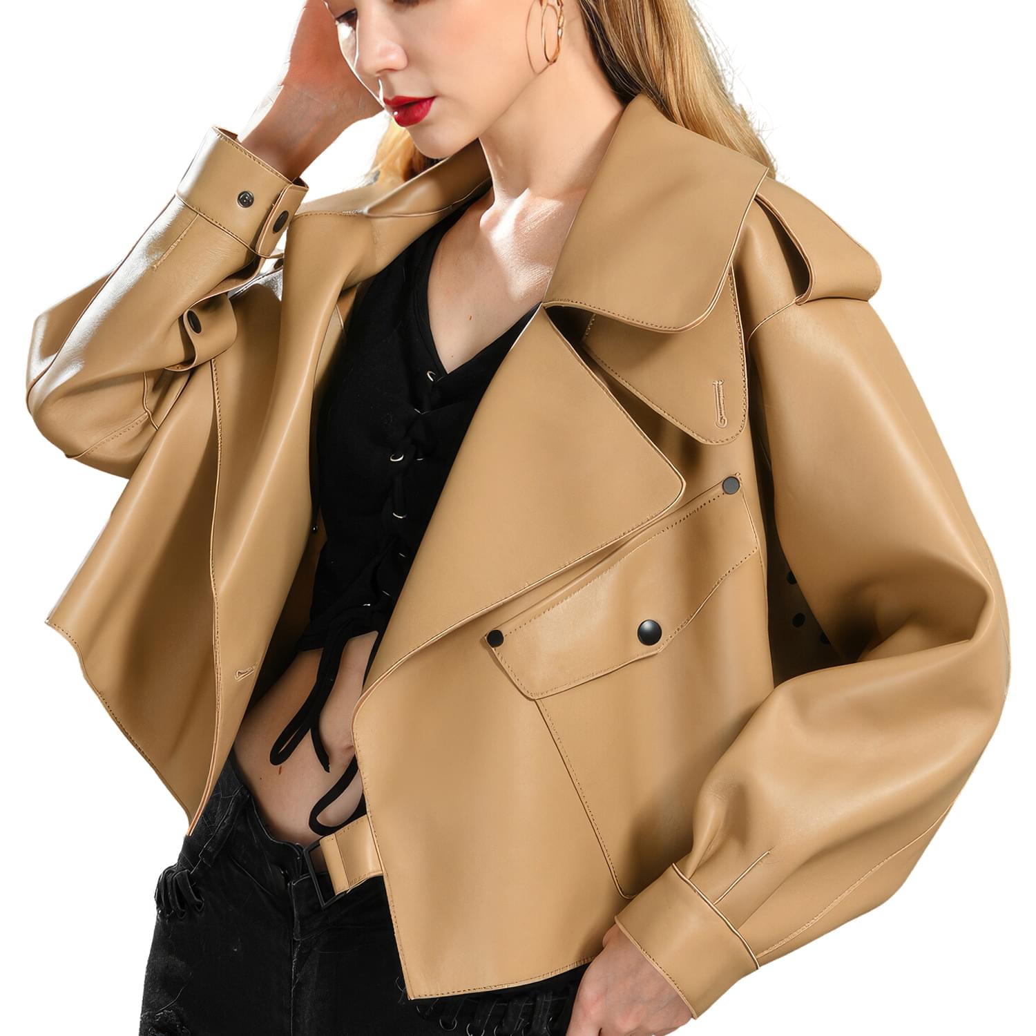 Elevate your high street fashion with the Women’s Biker Tan Brown Genuine Sheepskin Lapel Collar Rider Autumn Spring Fashion High Street Loose Smooth Crossover Leather Jacket. Crafted from premium genuine sheepskin, this leather jacket offers unparalleled style and comfort. The elegant lapel collar and unique belt strap closure create a distinctive and sophisticated look that will turn heads. With practical utility pockets for added functionality, this leather jacket seamlessly combines style and practicality. Perfect for autumn and spring wear, this versatile crossover leather jacket will quickly become a staple in your wardrobe, effortlessly complementing any outfit.